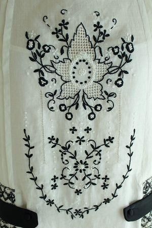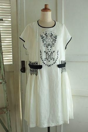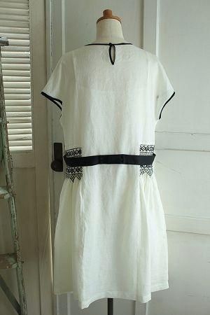 color アイボリー、(刺繍糸・ベルト・パイピング)ブラック、素材 Linen100%、(インナー)アセテート100%、made in China、size F、着丈96cm、バスト98cm、袖丈16cm、肩幅38cm、※セパレートタイプのキャミワンピの裏地付きです。
