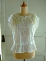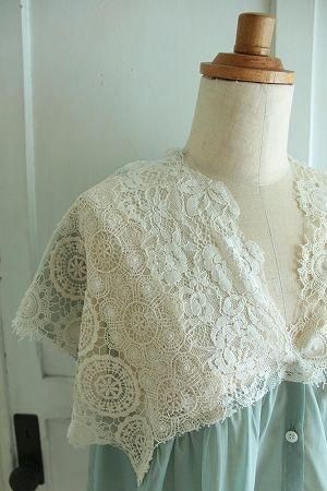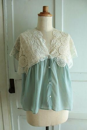 color モスグリーン、アイボリー、素材 コットン100%、(レース)コットン、ナイロン、made in Japan、size F、着丈52cm、バスト120cm、袖丈22cm、肩幅38cm、※裏地は付いておりません。