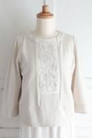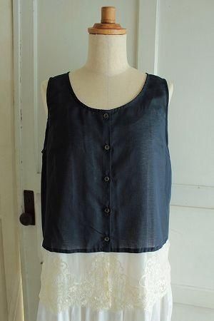 color インディゴブルー、(インナー)ネイビー、アイボリー、素材 リネン100%、(インナー)ポリエステル100%、made in Japan、size F、着丈53cm、バスト112cm、袖丈40cm(切替しより30cm)、肩幅38cm、※裾にレースが施されたセパレートタイプのインナー(ノースリーブ)付きです。