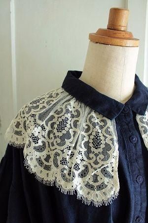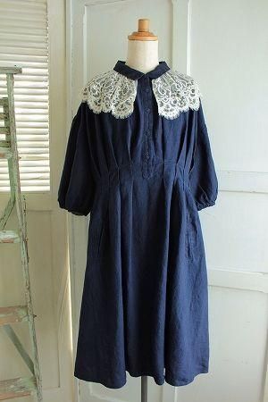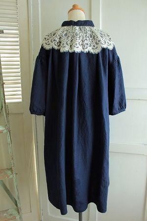 color インディゴブルー、素材 リネン100%、made in Japan、size F、着丈103cm、バスト112cm、袖丈40cm(切替しより30cm)、肩幅38cm、※レース襟はボタンで留まっております為、取り外しが可能です。裏地は付いておりません。
