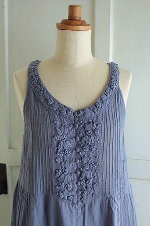 color ブルー(パープルに近いお色です)、素材 cotton100%、made in India 、size 38、着丈76cm、バスト95cm、肩幅38cm、※ウエストの切替し下より同素材のコットン生地が2枚重ねになっております。