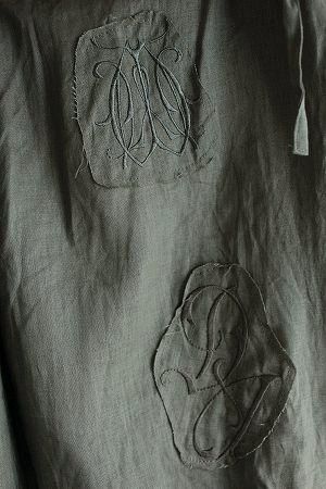 color オリーブグレー(カーキに近いお色です)、素材 リネン、(裏地)ポリエステル100%、made in Japan、size F、着丈98cm(股上28cm、股下71cm)、ウエスト66cm〜(ゴムとリボンが入っております)、ヒップ106cm、※イニシャル刺繍が施された切りっぱなしのモチーフがアップリケされています。フロント部分にスナップボタン、ファスナー・ひざにタックが施されています。太もも辺りまで裏地が付いています。