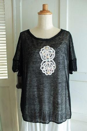 color ブラック、素材 Linen100%、(レースモチーフ)cotton100%、made in China、size 38、着丈57cm、バスト102cm、袖丈24cm、肩幅38cm、※袖口とサイド部分は異なる編地が施されています。