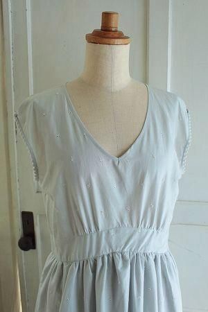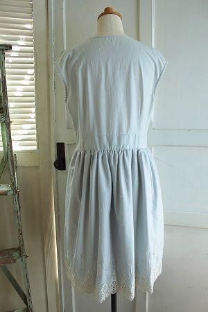 color サックス(グレーがかったお色です)、素材 コットン100%、(刺繍糸)レーヨン100%、(裏地)ポリエステル100%、made in Japan、size 38、着丈93cm、バスト90cm、袖丈5cm、肩幅38cm、※裏地はスカート部分のみとなります。左サイドにファスナーが付いております。