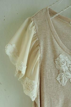 color ベージュ、素材 コットン40%、リネン30%、ポリエステル30%、(レース・別布)コットン、ナイロン、キュプラ、made in Japan、size F、着丈60cm、バスト85cm、袖丈14cm、肩幅38cm、※身頃部分はカットソー地、袖部分は光沢感のあるキュプラ素材の異素材の組み合わせとなります。