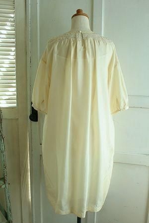 color クリーム、アイボリー、素材 シルク100%、(インナー)アセテート100%、made in China、size F、着丈98cm、バスト112cm、袖丈35cm(切替しより27cm)、肩幅38cm、※セパレートタイプのアンダードレス付きです。