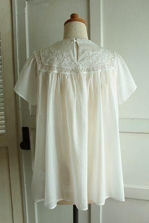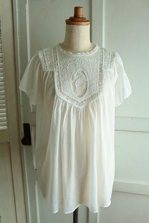 color オフホワイト、素材 cotton100%、(別布)ナイロン100%、(刺繍糸)ポリエステル100%、(レース)コットン100%、made in China、size 38、着丈65cm、バスト108cm、袖丈16cm、肩幅38cm