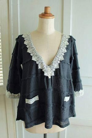 color チャコール、素材 アクリル65%、ナイロン25%、ウール10%、(レース部分)コットン100%、made in China、size 38、着丈58cm、バスト105cm、袖丈42cm、肩幅38cm