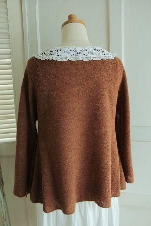 color モカ(数色の糸がミックスして織り上げられています。)、オフホワイト、素材 ウール75%、ナイロン25%、(レース付け襟 (基布)ナイロン100%、(刺繍糸)コットン100%、(外周)コットン90%、ナイロン10%)、made in China、size 38、着丈61cm、バスト102cm、袖丈54cm、肩幅38cm、レース襟はボタンで留まっております為、取り外しが可能です。