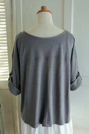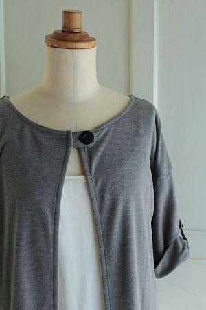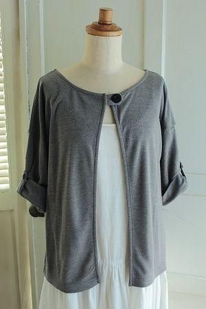 color グレー、素材 ポリエステル65%、レーヨン35%、made in Japan、size 38、着丈58m、バスト110cm、袖丈30cm、肩幅38cm、※裏地は付いておりません。前後どちらを前にしても着用頂けるデザインとなっております。