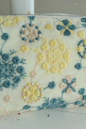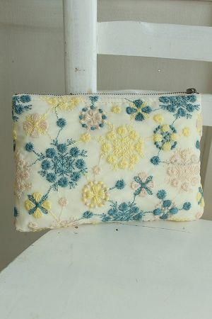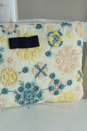 color アイボリー、(刺繍)ブルー、イエロー、ベージュ、素材 ポリエステル100%、(刺繍)ウール50%、アクリル50%、(裏地)ポリエステル100%、made in Japan、size 14×20cm