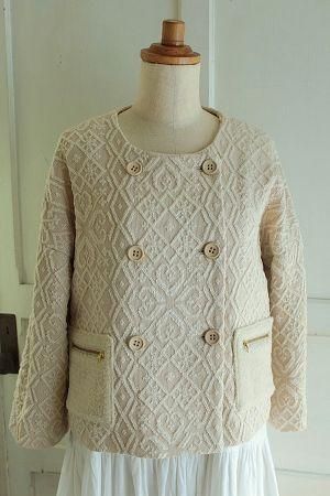 color べージュ、アイボリー、素材 ウール49%、レーヨン28%、コットン23%、(別布アクリル100%、裏地ポリエステル100%/コットン100%)、made in China 、size 38、着丈50cm、バスト96cm、袖丈48cm(切替しより34cm)、肩幅38cm