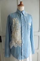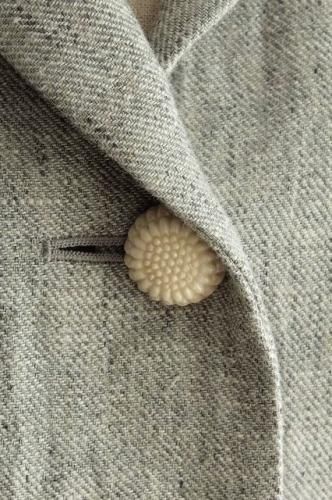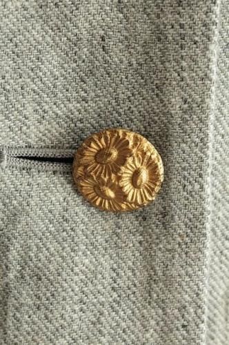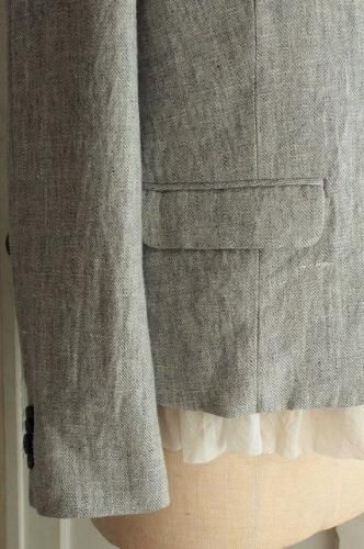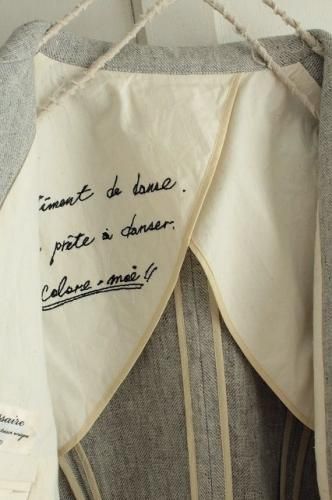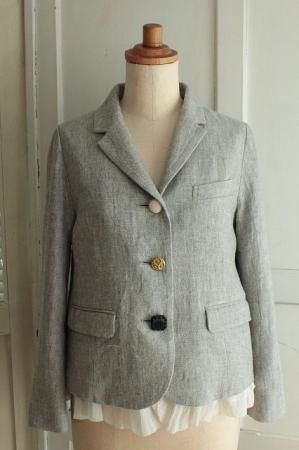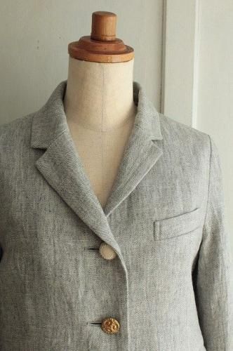 ロゴの刺繍が施された裏地が魅力的です。 シルエットがきれいな こだわりいっぱいのとっても素敵なジャケットです。 color グレー 素材 リネン100% (裏地)コットン100% (袖裏)ポリエステル100% (別地)コットン100% made in Japan size F 着丈50cm(フリル+4cm)、バスト90cm、袖丈55cm、肩幅38cm