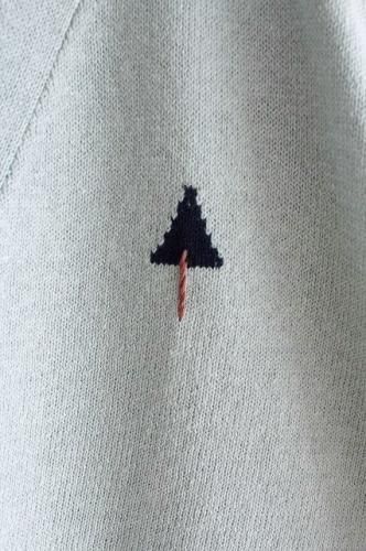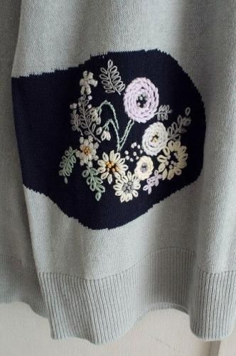 胸元のツリーの編み模様に裾のお花のハンド刺繍と