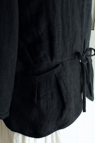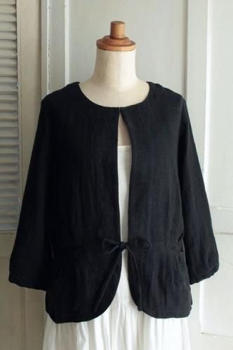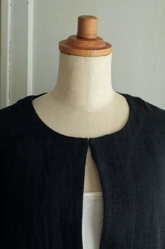 すっきりとした印象のノーカラーに首周り・フロントのステッチがアクセント。