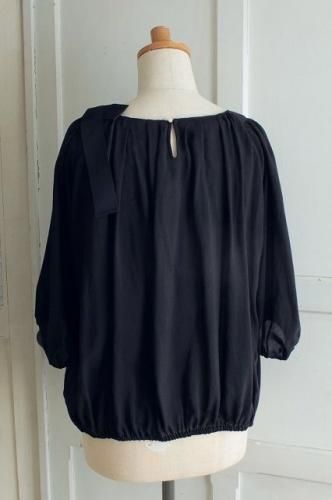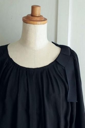 首周りと裾にはタック、袖口には細かいギャザーが施され