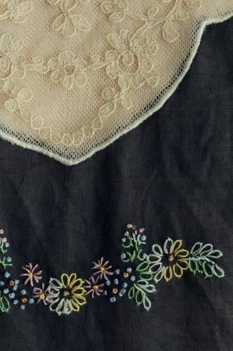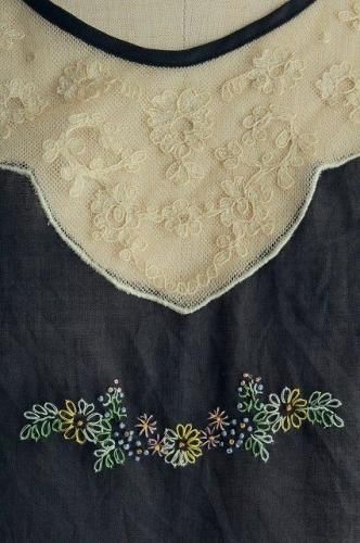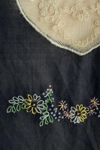 胸元にカラフルな2本取りの糸で施された繊細なお花の刺繍と
