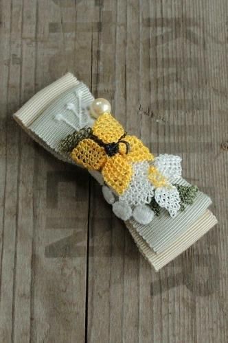 かぎ針編みの繊細なフラワーモチーフのoya(オヤ)が施されています。