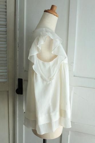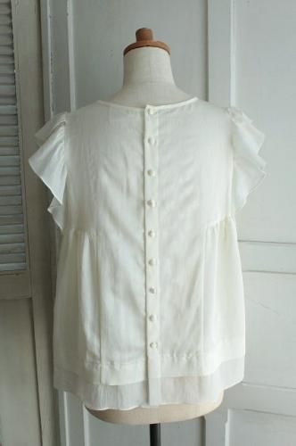 短めのひらひらの袖に裾の切替し、背中のボタンがアクセント。