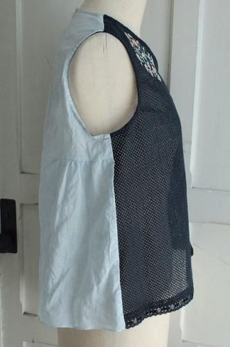 バックは縦にステッチの入った薄手のコットン生地の異素材の組み合わせ。