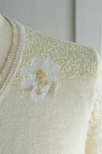 左肩に施されたカメリアのお花の編み模様やビーズ刺繍が魅力的です。