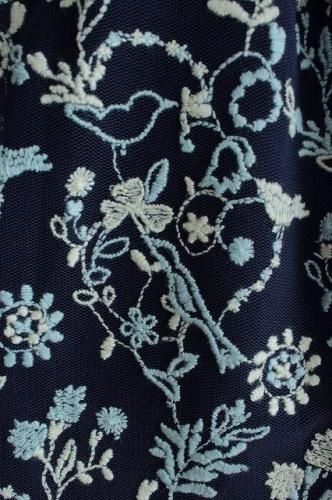 贅沢に施されたコトリや葉っぱの「魔法の森」の刺繍が魅力的です。