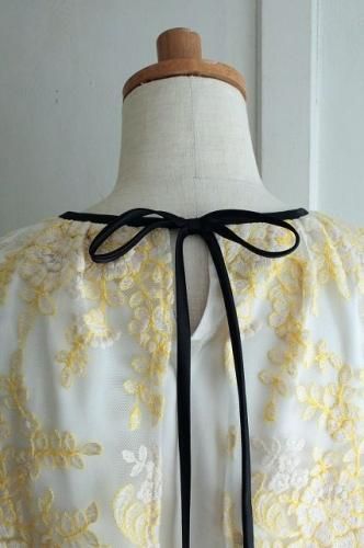 首周りの黒いパイピングと背中のリボンがアクセント。