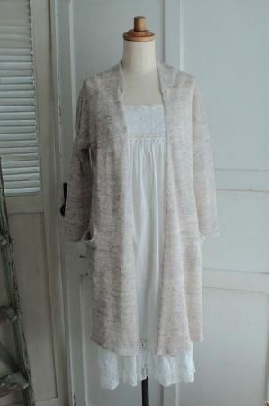 2色の糸をミックスして織り上げたさらっとした肌触りのリネン素材。 すっきりとした印象のショールカラーに サイドのポケットがアクセント。 いろいろな着こなしが楽しめる ナチュラルテイストの素敵なカーディガンです。 color ベージュ 素材 リネン100% made in China size M 着丈85cm、バスト フリー、袖丈53cm(切替しより36cm)、肩幅38cm