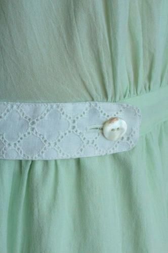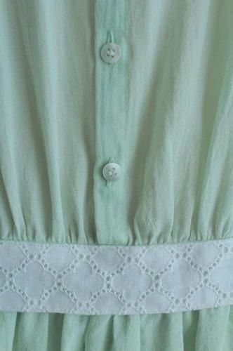 ウエストのリネンカットワークのベルトと背中のボタンがアクセント。