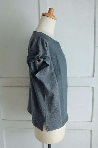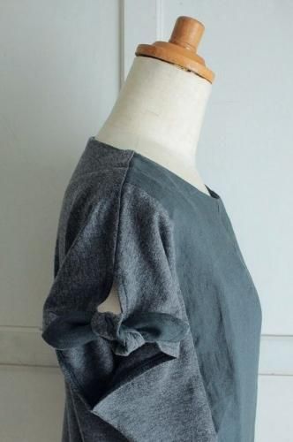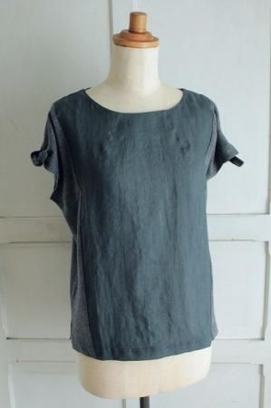 こちらはPorter des boutonsさんより届きましたプルオーバーです。 フロント部分ははりのあるリネン素材。 サイド・袖・バックはコットンニットの異素材の組み合わせ。 すっきりとした印象のフレンチスリーブの袖口のリボンが魅力的です。 シンプルなかたちのきれいなシルエット。 いろいろな着こなしが楽しめるとっても素敵なプルオーバーです。 color チャコール 素材 コットン100% (別布)リネン100% made in Japan size 着丈56cm、バスト98cm、袖丈14cm、肩幅38cm