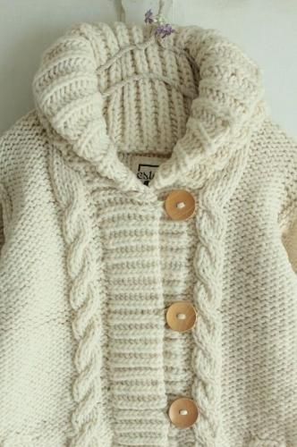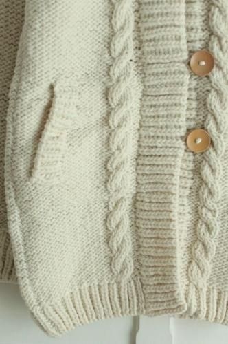 4つ並んだループのウッドボタンとケーブル編みがアクセント。
