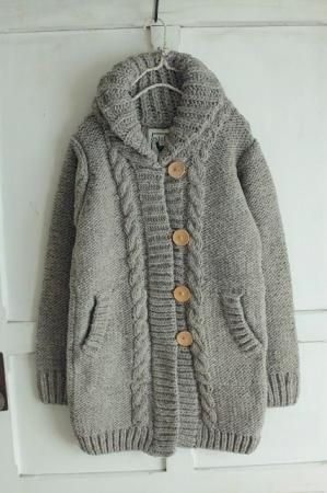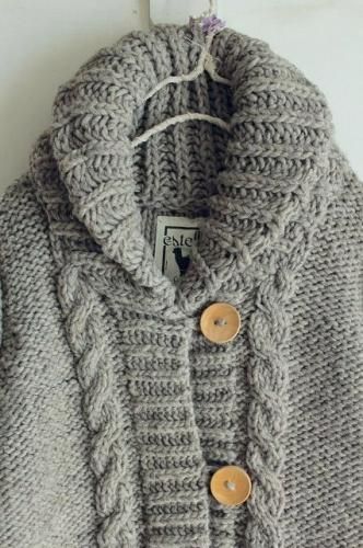 4つ並んだループのウッドボタンとケーブル編みがアクセント。