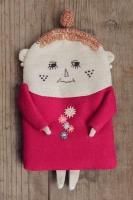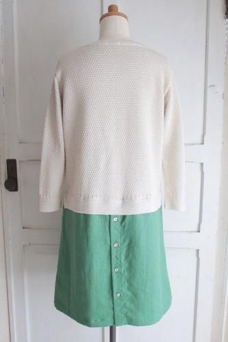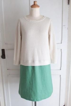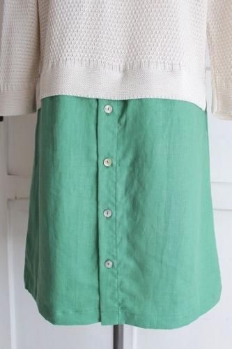 スカートは鮮やかなグリーンのはりのあるリネン生地。