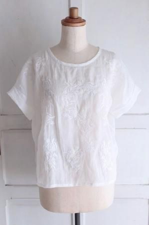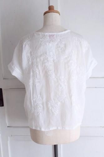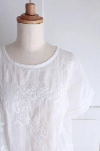 さらっとした肌触りの薄手のリネン素材。 全体に施されたお花のマシーン刺繍が魅力的です。 折り返した袖がアクセント。 身幅が広くゆったりシルエットに仕上げられています。 刺繍が目を惹くとっても素敵なブラウスです。 color オフホワイト 素材 リネン100% made in China size M 着丈53cm、バスト112cm 袖丈18cm、肩幅38cm