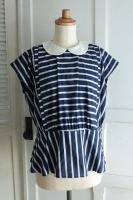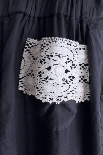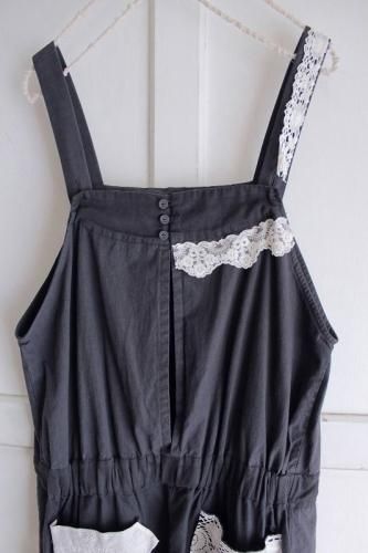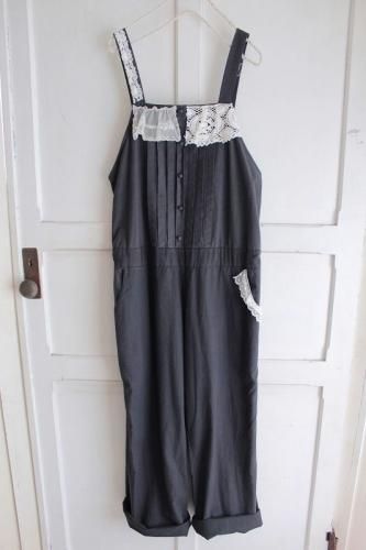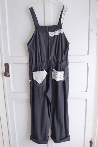 color ネイビー×ネイビー、オフホワイト 素材 コットン100%、その他 made in Japan size F 着丈(胸当てから裾まで)128cm バスト90cm、ウエスト82cm〜(ゴムが入っています) ヒップ106cm、太もも65cm、股下69cm ※裏地は付いておりません。 上下異素材の為、多少お色の違いがございます。 予めご了承下さいませ。
