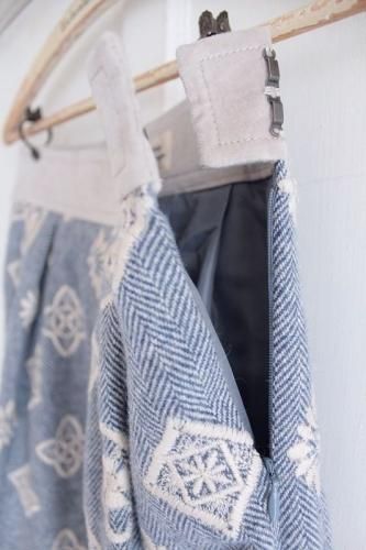 ブルーとオフのヘリンボンの織りのウールミックス素材。