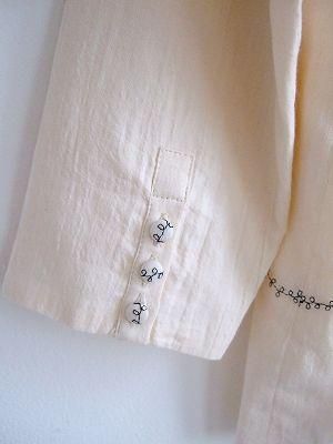 haupiaより届きました優しいお色のブラウスです。ボートネックのような、あまり見ないデザインのブラウスです。ひかえめなステッチと葉っぱのような刺繍がポイント。袖口に3つずつボタンが付いていますが、そのボタンは刺繍の入ったくるみボタンと細部にまでこだわりが感じられる1枚です。 背中にファスナーがついており、脱ぎ着も楽らくです。